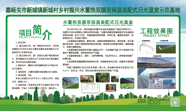 嘉峪關市新城鎮(zhèn)新城村鄉(xiāng)村振興水蓄熱雙膜雙保溫裝配式日光溫室示范基地水蓄熱雙膜雙保溫裝配式日光溫室是由內(nèi)蒙古農(nóng)業(yè)大學與內(nèi)蒙古中天科技有限公司聯(lián)合研發(fā)完成,并已在東北、西北、華北等地區(qū)進行了大面積的示范推廣。該溫室集成了10多項專利技術,實現(xiàn)了北方寒冷地區(qū)冬季不加熱正常生產(chǎn)果菜類蔬菜,對于促進設施蔬菜產(chǎn)業(yè)發(fā)展及帶動當?shù)剞r(nóng)民增收致富有著非常重要的意義,該溫室具備以下特點: