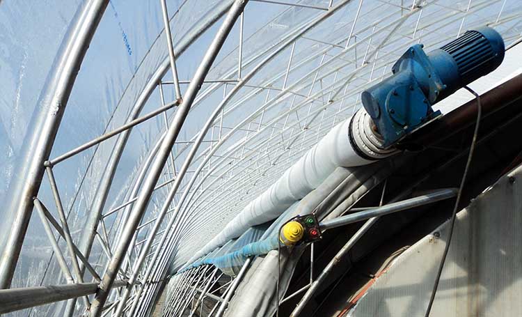 智能溫室內保溫被簾采用兩層化纖面料經單面涂銀處理,中間保溫層采用120克好質量棉加工而成,成品重量為220克,幅寬4.3米,長度可定制。